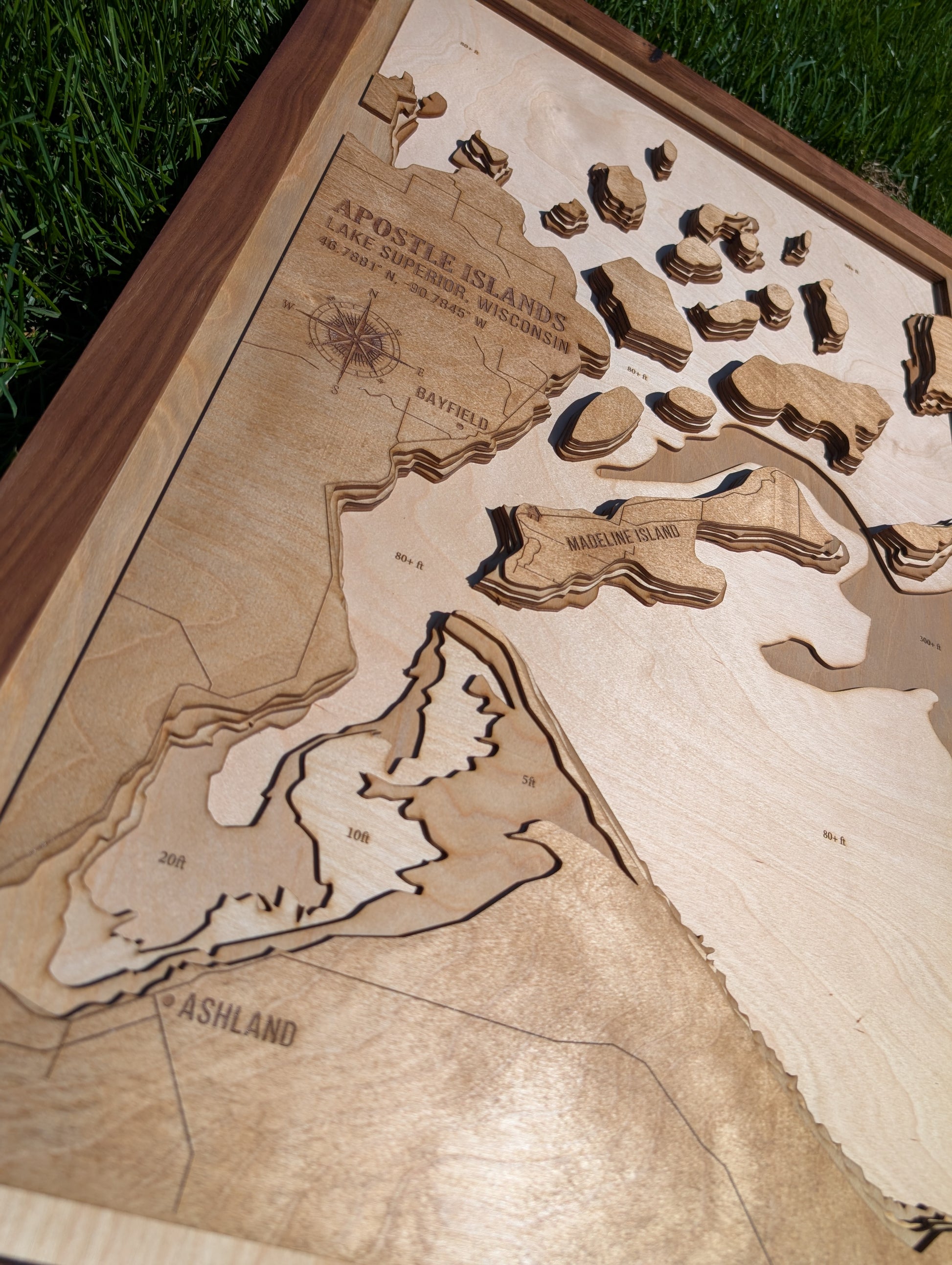 Handmade wooden coastal depth map of the Apostle Islands, Lake Superior. It is made with 6 layers of Baltic Birch and finished with a solid Walnut frame. Depth markers (ft), compass, coordinates and location name are engraved into the wood. Each layer is coated in natural stain and finished with a protective oil. Comes with hook on the back.